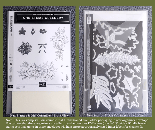 Here are 5 sets of stamps that I’ve already transitioned from their old cases into their new ones. Note that the 5 older cases together take up about 3” of shelf storage space, while the 5 new cases take up only 1” of space! Of those 5 newer cases, 4 of them contain photopolymer stamp sets, and 1 has a “cling” (aka red rubber) set inside. Two of the envelopes also each contain a full set of coordinating dies (mounted onto magnet sheets for convenience), while another organizer holds a smaller set of dies, along with its associated stamp set. So yep, you read that right! 5 stamp sets, including 1 set of red rubber (“Cling”), and 3 sets with dies stored inside, take up only a total of one inch of shelf space! (As compared to the 5 older cases, which together take up 3 inches of space, yet their coordinating dies were stored elsewhere.) For those of us who want to convert at least some of our older sets to this new storage system (🙋♀️and yes, that’ll include ME!”), empty organizers are available in the online store now, and come in sets of 10. So I’ve already begun converting some of my older stamps & die sets into these envelopes. I LOVE the fact that most of my dies that coordinate with a specific stamp set can now be added right into the same slipcase! Talk about convenient! But! No worries. If you’re still in love 🩷 with the classic DVD containers, they’ll still remain available in the online store. At least for a while, anyway. 😉